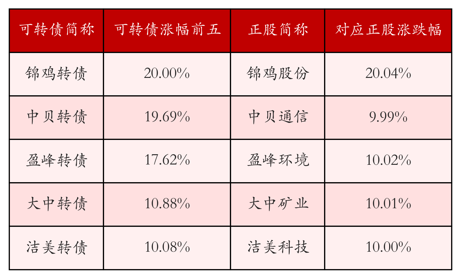 南财智讯4月16日电,盘后数据显示,债市方面,中证转债指数收涨1.39%,报514.68,成交额为898.7亿元。可转债方面,今日共成交339只可转债,其中310只收涨,0只收平,29只收跌。具体来看,83只可转债涨幅超过2%。其中锦鸡转债(123129)涨20.0%,中贝转债(113678)涨19.69%,盈峰转债(127024)涨17.62%。今日有3只可转债跌幅超2%,万顺转2(123085)跌2.61%,泰坦转债(127096)跌2.47%,华兴转债(118003)跌2.35%。存在交易量的可转债所对应的正股中,261只收涨,10只收平,68只收跌。具体来看,33只可转债对应正股涨幅超过5%,其中,锦鸡股份(300798)涨停,收涨20.04%。同时所对应的可转债:锦鸡转债(123129)同涨20.0%。今日有2只可转债对应正股跌幅超过5%,没有正股跌停。
